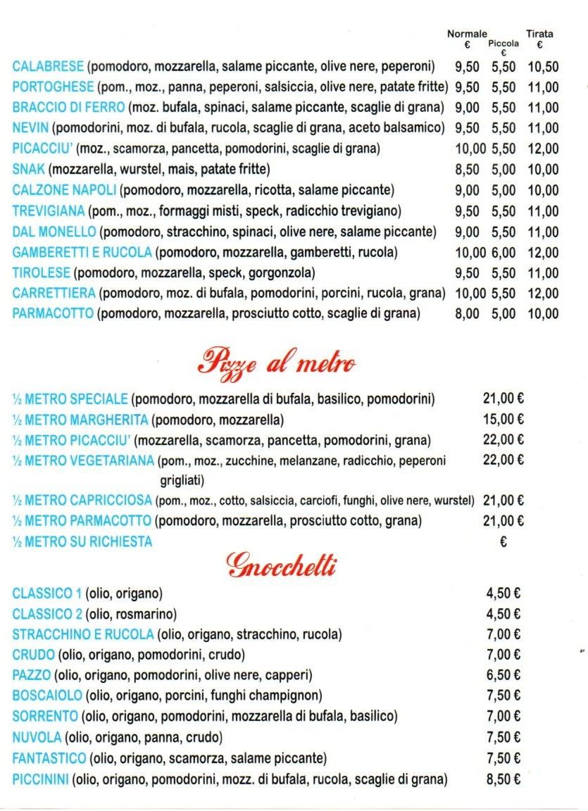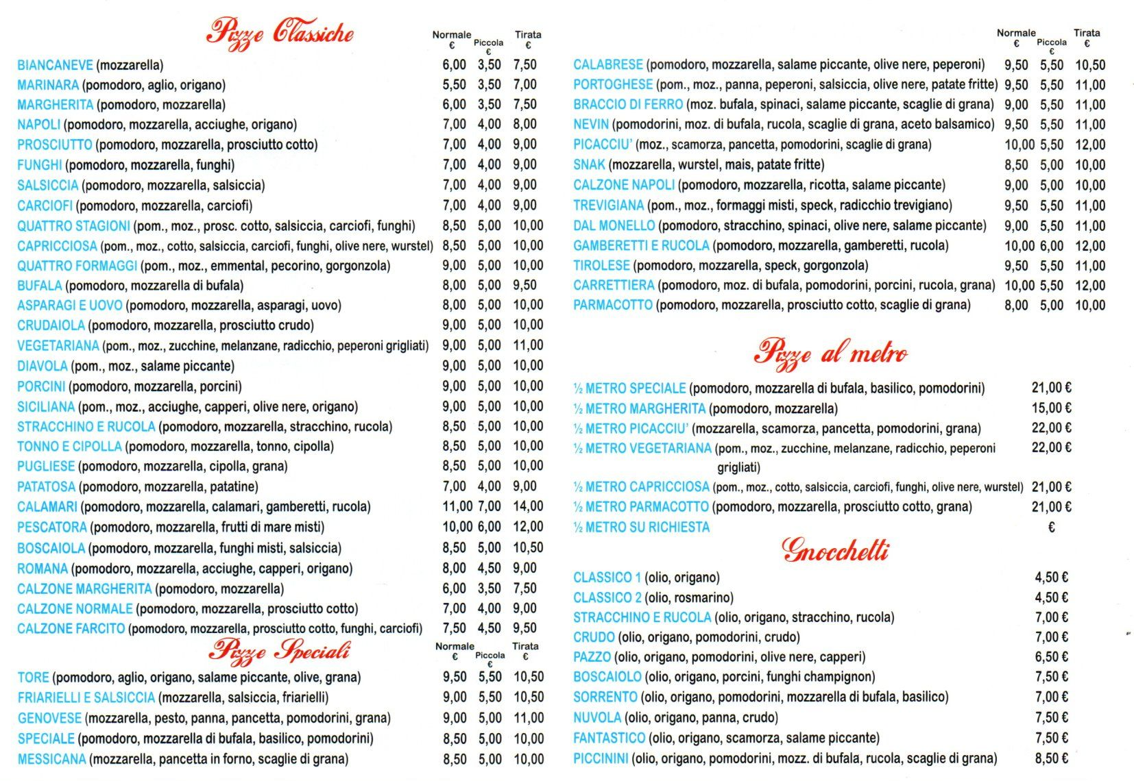 Tra amici, in famiglia, da solo o in compagnia, consulta la lista del menù per scoprire le pizze tradizionali, speciali e quelle a metro e per consultare la vasta scelta di gnocchetti farciti d'asporto.